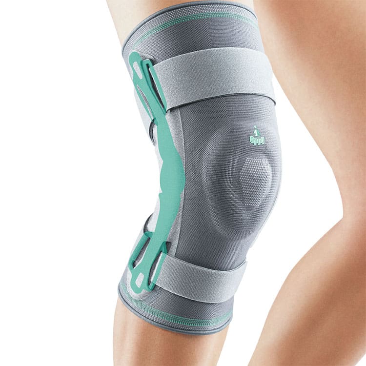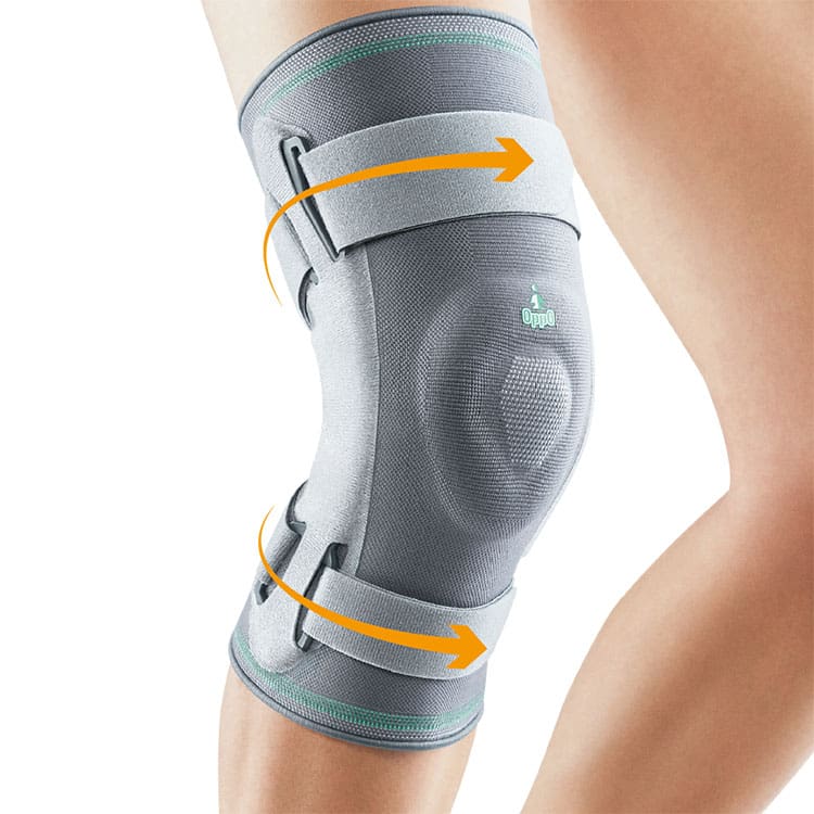 - A motion hinge provides support to both sides of the knee, with a silicone pad to maintain patella position